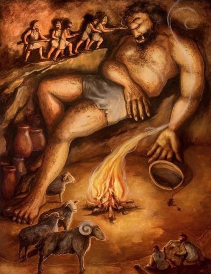 The Monstrous Polyphemus: Polyphemus is depicted as a massive and brutish creature with a single eye in the center of his forehead. He is a shepherd who tends to his flocks and lives in isolation. When he discovers the intruders in his cave, he becomes furious and begins to destroy Odysseus’ men, show casing the immense power of these mythical beings.