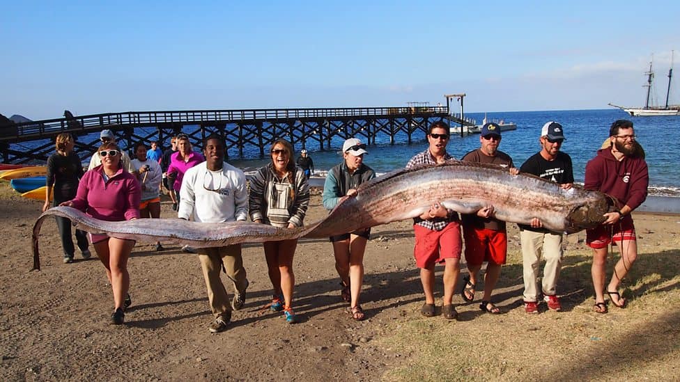 Giant oarfish are rarely seen, because they typically live at ocean depths of 600 to 3,300 feet. The massive, eel-like creature is thought to have inspired tales of giant sea serpents. It is not well studied or well understood. There are rare events of sightings. Most of the oarfish witnessed come to shore presumably to die. Of the recent documented encounters, the creatures are non-threatening to mankind and in failing health.