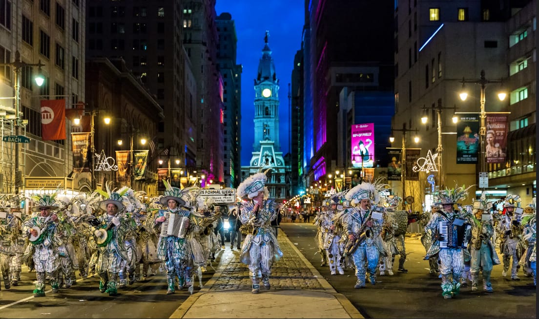 George Washington (1732-1799), who was America’s first official President, from 1789 to 1797, lived in the President’s House right on 6th and Market Street. He is credited with calling upon the Mummers New Year’s Day to celebrate the holiday for all the 7 years he lived in Philadelphia, PA.