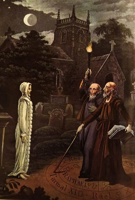 As a partner with Edward Kelley, one of their occult practices together was the summoning of ghosts to gain extra insight into the afterlife and in the belief that ghosts can foretell the future. There are old illustrations from the early 1800’s of John Dee and Edward Kelley standing in a magic circle while in a church graveyard with the ghost of a deceased woman standing outside the circle whom they invoked. In regards to John Dee and Edward Kelley in the old images, one of them holds a burning torch upward, while the other man holds a cane or staff downward in one hand and in the other hand holds a big open book that most probably is a book on occult magic.