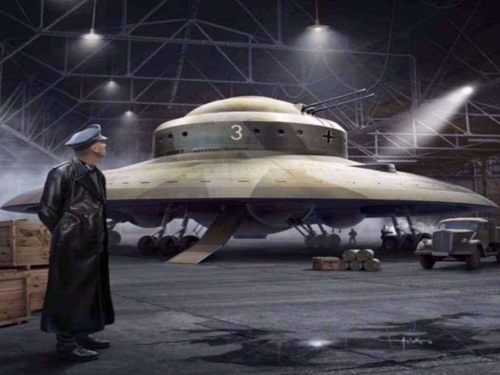 The Nazis experimented with jet turbine engine air craft. Their most advanced jet turbine airplane was the Messerschmitt Me 252, nicknamed Schwalbe (German “Swallow”), in fighter versions of Sturmvogel (German “Storm Bird”) in fighter bomber types. That aircraft was the world’s first operational jet powered fighter aircraft and looked nothing like a flying saucer nor any alien style UFO. Manufactured by the Messeschmitt Corporation, the first flight of the jet engine airplane was on April 18, 1944 and introduced in warfare in April 1944.