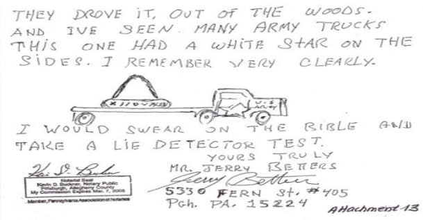 One of the eyewitnesses was Jerry Better, a Pittsburgh Jazz vocalist who was interviewed by The Trib-Review Newspaper during the fortieth anniversary of the incident. Mr. Betters recalls hearing about the crash on the radio on the evening of Dec 9, 1965, and decided to head out to the site with several others. The military was already blocking the main roads but he knew the back roads and arrived on the scene. There were many soldiers there, even military brass, and people with lab coats on. Betters said the craft he saw had strange hieroglyphics writings on it was loaded up on a flatbed truck and driven out of the woods.